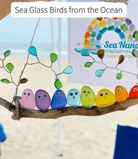 Each tiny bird is carefully shaped from genuine sea glass and perched on natural driftwood, creating a beautiful decoration that catches sunlight and glows with vibrant color.