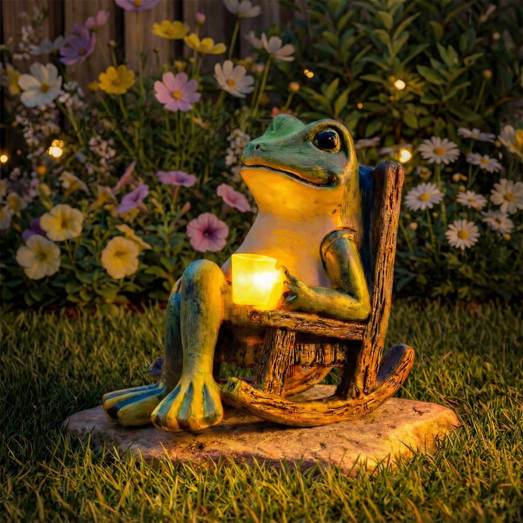 Bring a touch of charm and warmth to your outdoor or indoor space with this solar-powered frog garden statue. Crafted from eco-friendly resin and hand-painted for a rustic finish, this delightful frog relaxes in a wooden-style rocking chair while holding a glowing lantern.